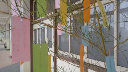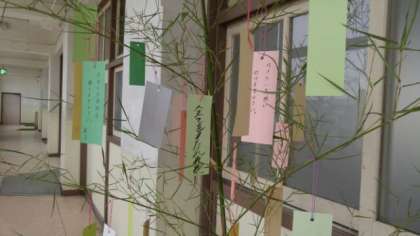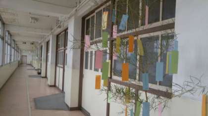 今日は、七夕(たなばた)。各クラスの教室前の廊下には、たくさんの短冊の付いた笹が立てられています。写真は、3年生のものですが、「自分の行きたい高校に行けますように」や「引退試合勝てますように」など3年生ならではというものがほとんどでした。なかには「お金が欲しい、今ないんや」「イケメンと結婚」などもありました。