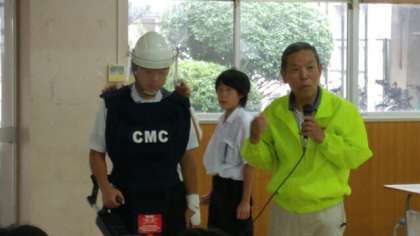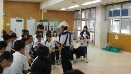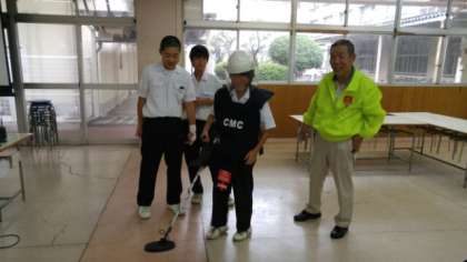 各学年から、一人ずつ防護服とヘルメットを着用し、探知機を扱う体験をさせていただきました。実際は、探知機だけでも約10キロの重量があるそうです。遠隔操作できる専用車だけでは対処しきれないので、高温多湿の中、非常に慎重に少しずつ作業をしていきます。気の遠くなるような作業です。