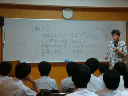 昨日、5限3年生の総合の時間を活用して、「ホームレス問題授業づくり全国ネット」共同代表の生田武志さんを講師にお招きして、『野宿生活者問題』に関わっての学習を行いました。生田さんの長年の夜回りなどのボランティア活動の経験からの現実味あふれるお話に生徒たちも食い入って聞いていました。「襲撃事件」などにみられる差別や偏見などについても学習することができました。