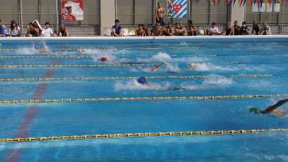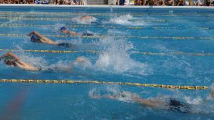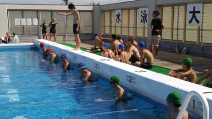 男子25m自由形の様子です。水泳帽緑色は1年生、青色は2年生、赤色は3年生です。写真手前から、1−1、1−2、2−1、2−2、3−1、3−2の順に並んでいます。