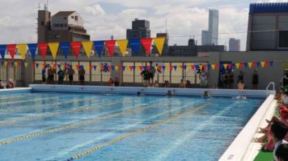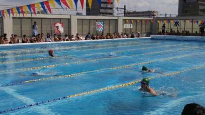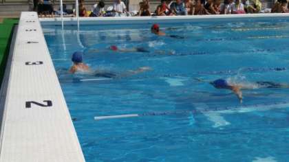 男子25m平泳ぎの様子です。澄み切った青空ですが、陽射しが強くなってきて、天気予報以上に暑くなってきた感じがしました。遠くに学級旗も見えます。