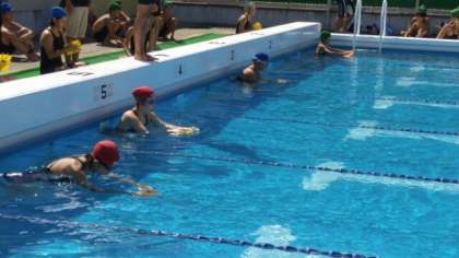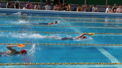 女子25mパドルの様子です。手に「パドル(水かき)」を付け泳ぎます。なかなか扱いが難しいようで、途中でパドルが外れてしまう人もいます。
