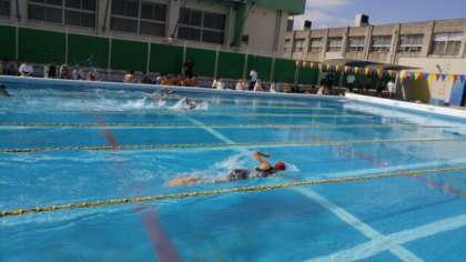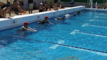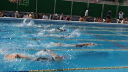 女子25mフィンの様子です。足にフィンを着けて泳ぎます。上手に扱うと格段にスピードが上がります。