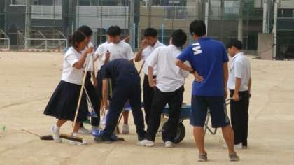 多くのガラスの破片が、校内の多くの場所に散乱している状態でしたが、昨日のうちに教職員等で処置しました。今日は、生徒に協力してもらってグランド表面を土ごとさらいました。まだまだ暑い中でしたが、積極的に動いてくれました。協力ありがとうございます。