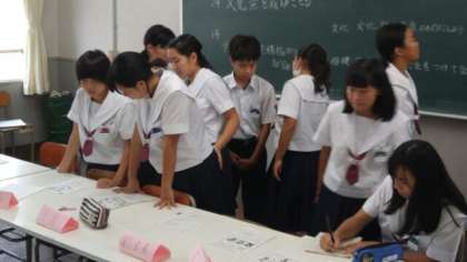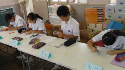 続いて、文化祭しおりの表紙の選考(写真1枚目)をしました。その後、各委員会から「9月の目標と達成するための具体的方策」の発表、それを玄関入ったところに掲示するための用紙に記入する作業(写真2枚目)と続きました。また、写真には写っていませんが、旧役員の3年生3名が生徒会室の外で別の作業をしてくれていました。
