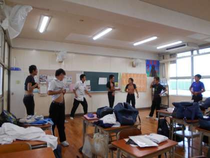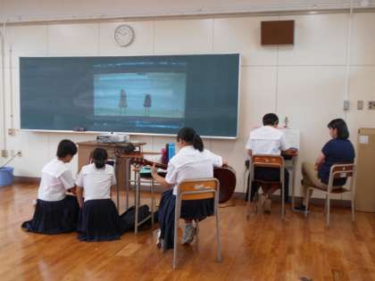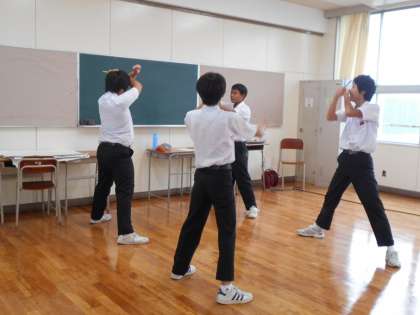 3年生はグループ別に分かれての発表です。自分たちで内容を考え、試行錯誤しながら取り組んでいます。練習時間が非常に少ないので、各グループで夏休みや放課後に集まって練習しています。