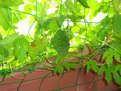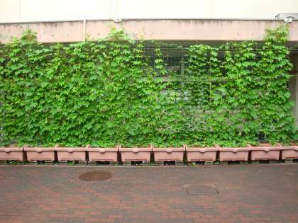 6月5日に緑化運動の一環として生徒会役員が植えたゴーヤが、1か月で実をつけるまで成長し、食堂前に立派な緑のカーテンができあがりました。