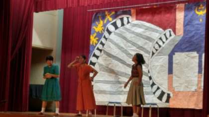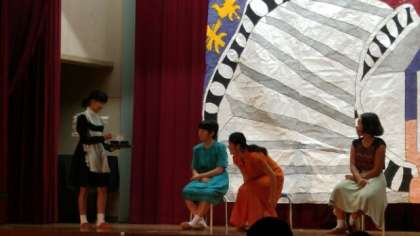 プログラム3番、2-1による劇「シンデレラ」です。「シンデレラ」には、「灰かぶり娘」というような意味があるそうで、姉たちにバカにされてそう呼ばれていたそうです。