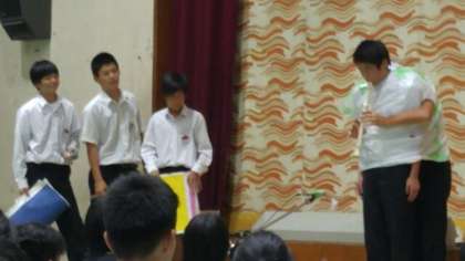 太鼓を片付けている間に3年生有志が幕間(まくあい)芸を披露しています。2人羽織でアルト笛を演奏しています。意外と上手に演奏できたので曲名もすぐにわかりました。