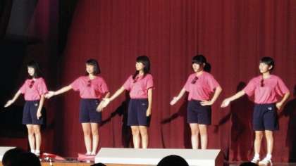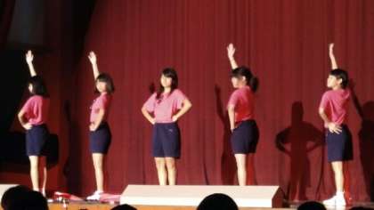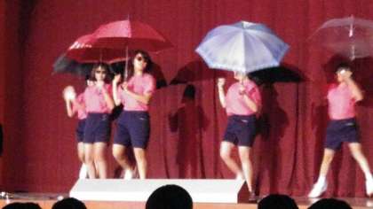 「Aμ's」のダンスです。今度は「チャリチョコ オーガスタ」というグループの歌に合わせて踊っています。サングラスに傘で元気な女の子、という感じのダンスでした。