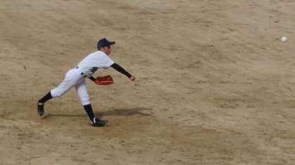 守備の様子です。投手は1年生です。写真は、打者をピッチャーゴロに打ち取りアウトにしたところです。