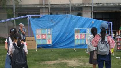 本校生徒も模擬店のお手伝いに来ていました。ストラックアウトやフリスビー投げ、ゴム鉄砲などいろいろなアトラクションがありました。グランド中央では、今宮工科高校がミニSLを運転、多くのちびっ子たちが順番に乗り込んでいます。