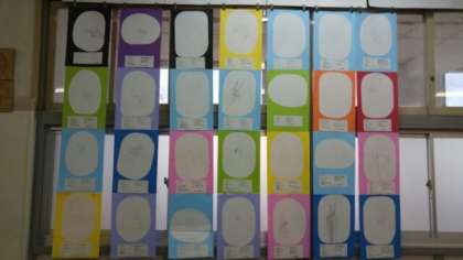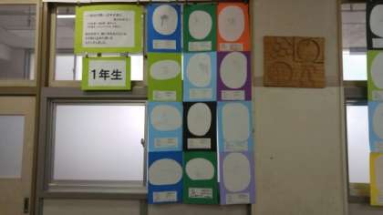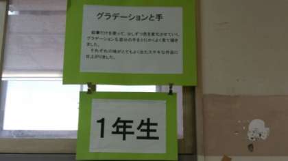 続いて美術室の展示作品です。まず、1年生美術の時間に作成した「グラデーションと手」です。鉛筆だけを使って、少しずつ色を変化させていくグラデーションの技法で書き上げたものです。