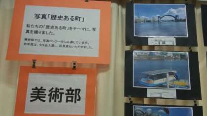 美術部作品、「写真『歴史ある町』」です。私たちの「歴史ある町」をテーマに、写真を撮りました。撮影場所は、落合下の渡しのようです。