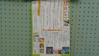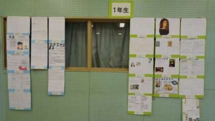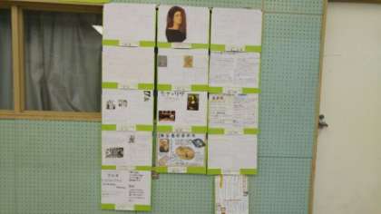これも1年生の作品です(3枚目写真左は2年生作品)。ピカソやゴッホ、ダビンチの他に、ラファエロ、モネ、だまし絵で有名なエッシャーなどが紹介されていました。