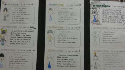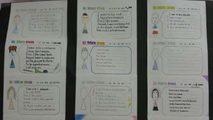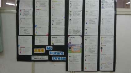 2年生は、「MY Future Drem」。英語で将来の夢について似顔絵とともに紹介しています。