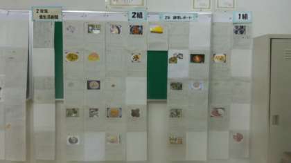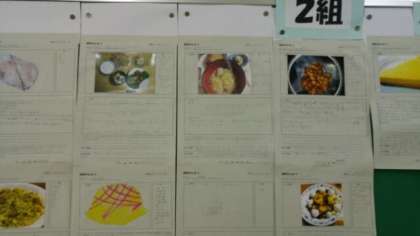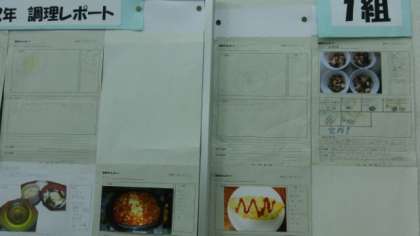 2年生「食生活新聞 調理レポート」です。写真やイラスト付きでチャレンジした料理が紹介されています。「たまご焼き」や「フレンチトースト」「パンケーキ」「オムライス」「麻婆豆腐」「からあげ」、中には「チーズダッカルビ」「出汁で作るお吸い物と茶碗蒸し」というものもありました。