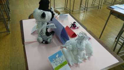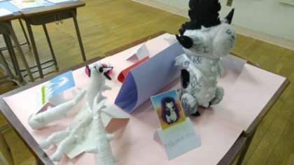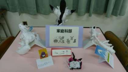 家庭科部の作品展示です。オリジナルのキャラクター「大狂乱の暗黒のネコ」などとネーミングされていました。パソコンでキャラクターのイラストを作り、ぬいぐるみや紙粘土で立体化した作品です。
