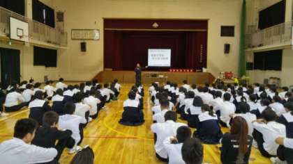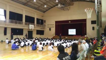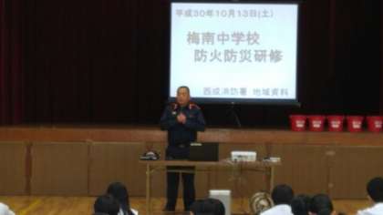 前半は、小学生は小学校で防災に関する取組に参加しました。写真は中学校での様子です。「梅南中学校防火防災研修」と題して、消防署の方から講話がありました。たくさんの地域の方等の参加をいただきました。