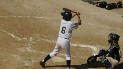 10月21日(日)、本校グランドでは野球部の7B秋季新人大会が開催され、加賀屋中学校と対戦しました。写真は、1回表の梅南中の攻撃です。先頭(背番号1)がいい当たりでしたがピッチャーゴロで倒れ、1アウトから2番(背番号6)が打席に立ちました。2年生の女子部員です。