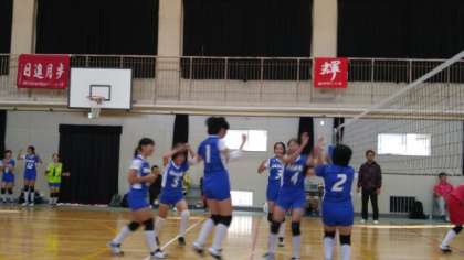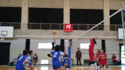 息詰まる展開でしたが、20−20から一気に流れが梅南中に傾きました。写真は、勝利の瞬間です。相手チームもボールに跳びついていますが、拾うことができず、結局25−20で第3セットを取りました。しんどい試合を勝利して跳びあがって喜んでいます。これで、3戦全勝で予選リーグ1位通過となりました。