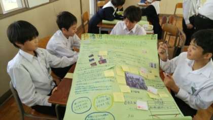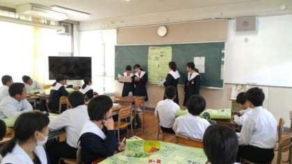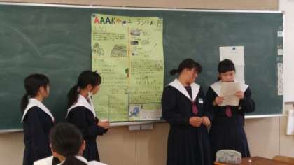 文化祭で作品として展示した調べ学習「世界の諸地域」を使って、各班が5〜6分でプレゼンをする、という内容で、先生からは、「発表が終わると、付箋に感想を書き、貼りにいくこと」などの指示がありました。