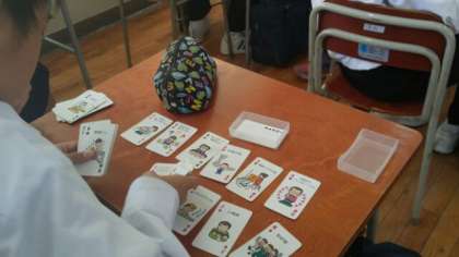 写真は5限目、2組の様子です。まず、講師先生により1人に1組のトランプのセットが配られます。52枚のカードには、ハートやスペードなどのマークや数字の他、「おおらか」「めんどうくさがり」「まじめ」など性格を表す文字が書かれており、「自分はこれかな」と感じたカードを10枚選びます。