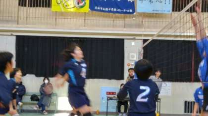 梅南中は、若江中(東大阪市)、港中(大阪市)、泉ヶ丘東中(堺市)と戦います。初戦、若江中に25−21、25−22のストレート勝ちを収め、写真は対港中戦の様子です。