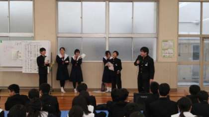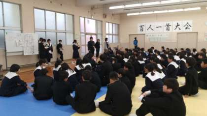 1月23日(水)5,6限、柔道場にて1,2年生合同「百人一首大会」を実施しました。目的は、「競技を通して、学級及び学年の団結と親睦を図る」「日本の伝統文化に触れ、古典に親しむ」です。各クラス、男女混合3人ずつ(場合によっては2人)のチーム編成で全2試合(出席番号班と実力別班)を学級対抗で戦います。