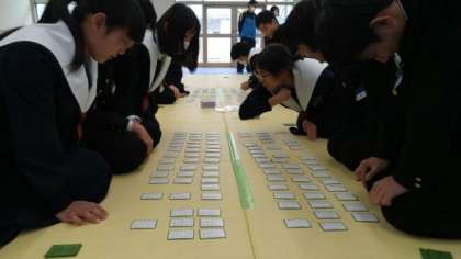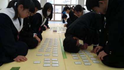 この写真3枚は、同じチーム同士の対戦です。2年生男子がお手付き(1枚目)をし、悔しがり、2年生女子が1年生のお手付きを誘おうとしたのかフェイントをかけ(2枚目)ますが、結局札を取ったのは1年生(3枚目)でした。