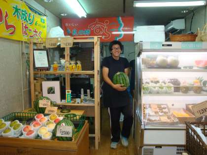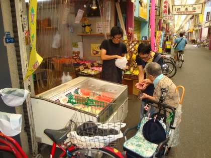 夏季休業中、先生方もそれぞれ研修や部活動、2学期の準備など忙しく毎日を過ごしています。今日は、『社会体験研修』に参加した二人の若手教員を紹介します。写真は、鶴見橋商店街の中にある果物の店(安心屋)で体験研修(接客・販売・品出し)の様子です。