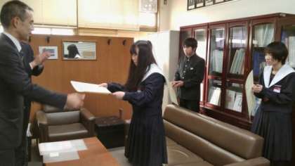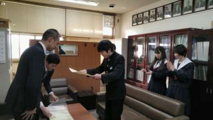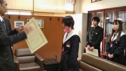 2月5日、本校美術部員3名が「第2回絵画・写真コンクール」の表彰状を授与されました。これは、西成区青少年指導員協議会主催のコンクールで、本校は写真の部に応募しました。その結果、2年生男子が「区長賞」、3年生女子がそれぞれ「佳作」を受賞しました。担当の方が来校し、3人に表彰状と記念品を授与していただきました。