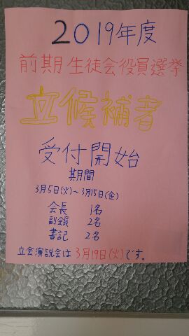 立会演説会は3月19日(火)です。1,2年生の皆さん、経験の有無を問いません、奮って立候補してください。きっといい経験になります。