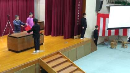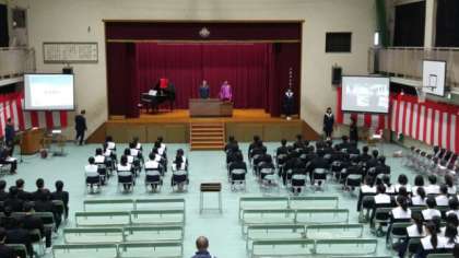 続いて、「卒業証書授与」です。まず、3年1組の授与の様子です。卒業証書は、証書ファイルに入った状態で受け取ります。