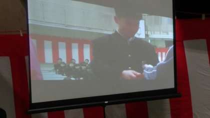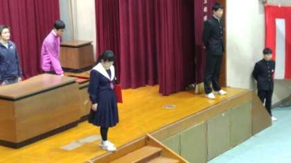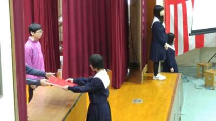 続いて、3年2組の授与の様子です。当日は、ピーンと張りつめたような空気の中、きっと緊張すると思いますが、「今日よりも大きな声でハイッ!と返事」を心がけてください。それと、「待っているときの目線」「階段を下りる前の目線」に注意して、かっこよく決めてください。卒業生一人ひとりが一番目立つところです。一生に一度の中学校の卒業式、恥ずかしがらずに威風堂々、頑張ってください。