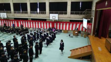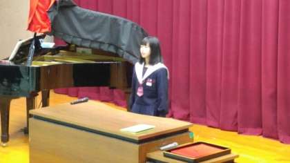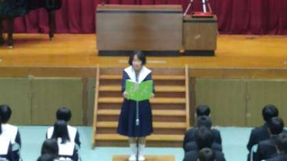 「学校長式辞」「PTA会長祝辞」「来賓紹介」「祝辞・祝電披露」の後、「在校生代表送辞」、「卒業生答辞」です。今日は予行なので、それぞれ一言だけで終わりました。緊張すると思いますが、明日の本番頑張ってください。
