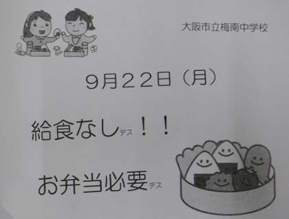まつば小学校が代休のため、9月22日(月)の給食の提供はございません。