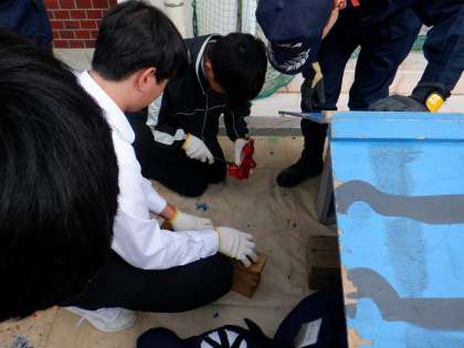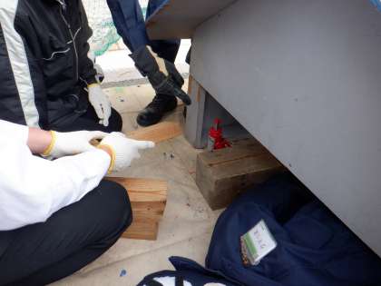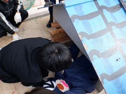 倒壊家屋をジャッキを使って持ちあげ、「クマッタ」君を助けています。