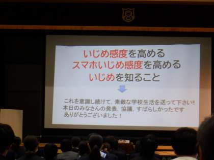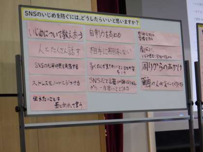 梅南中学校からは、生徒会の2名が参加し、「SNSのいじめを防ぐためには何ができるのか」について考えました。