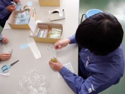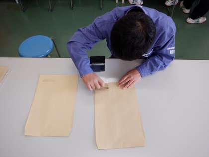 品物を袋に詰めたり、封筒に宛名のスタンプを押す作業をおこないました。工程が多く集中力が必要な作業が多かったですが、真剣に取り組んでいる様子が見られました。