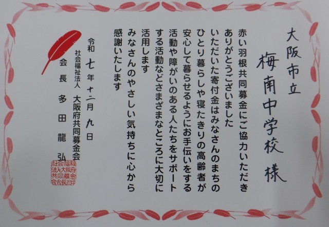 先日、生徒会が赤い羽根共同募金活動行い、たくさんの生徒のみなさんから募金が集まりました。