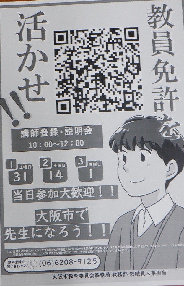 詳細は⇒「大阪市教育委員会講師登録・説明会HP」まで