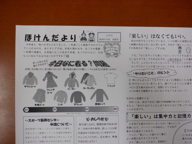ほけんだより 公開日 2026/03/05 更新日 2026/03/05 お知らせ ほけんだより3月号と増刊号を配布文書にUPしました。3月号は、「スポーツ振興センター申請について」と「次年度のおしらせ」などを掲載しています。増刊号は、学校保健委員会の報告を掲載しています。また、こちらからもご確認いただけます。⇒3月ほけんだより・ほけんだより増刊号 いいね(1)