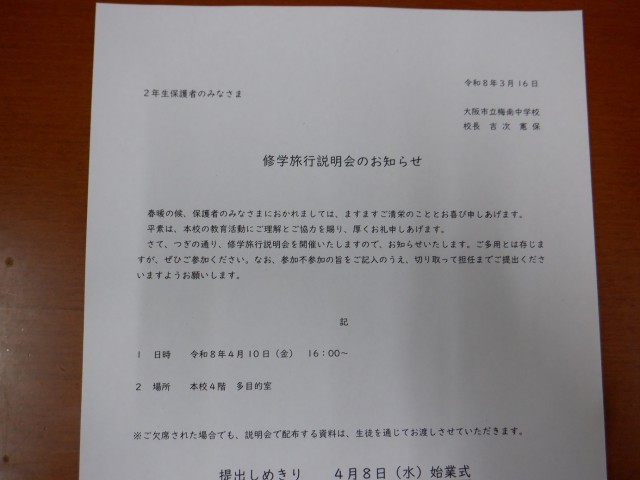 明日は修学旅行説明会です