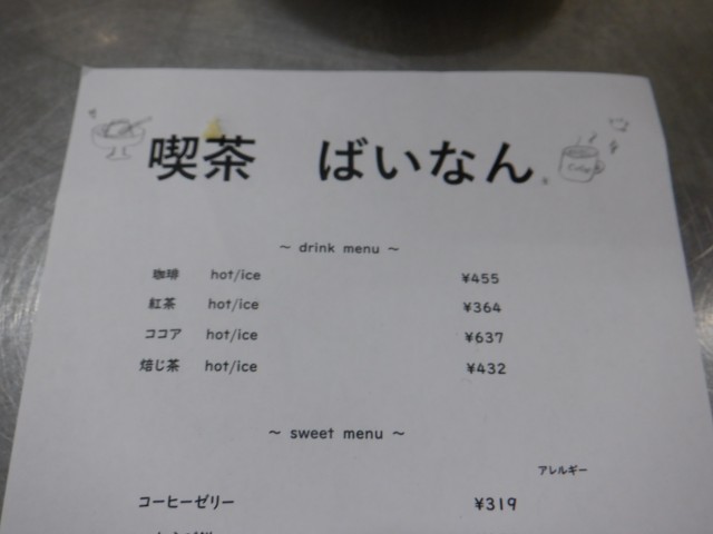喫茶「ばいなん」にて、コーヒーゼリー・蒸しパン・わらび餅・プリンを頼んで喫食します。