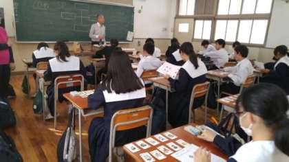 写真は5限目、2組の様子です。まず、講師先生により1人に1組のトランプのセットが配られます。52枚のカードには、ハートやスペードなどのマークや数字の他、「おおらか」「めんどうくさがり」「まじめ」など性格を表す文字が書かれており、「自分はこれかな」と感じたカードを10枚選びます。 -