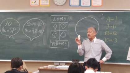 黒板に「52−10=42 私の可能性」と書かれてあるのが見えますが、これは、選ばれなかった42枚のカードを表しており、それはつまり「自分の可能性であり、それを伸ばすのに大事なのは『そうしよう』と決める心」なんだとおっしゃっていました。講師先生、楽しく自分の特性を考える時間をありがとうございました。 -