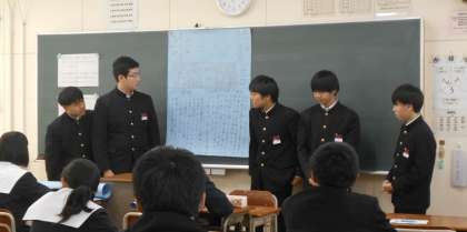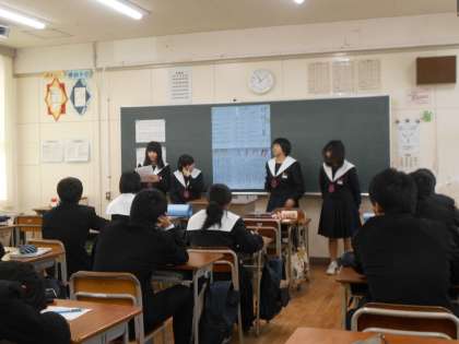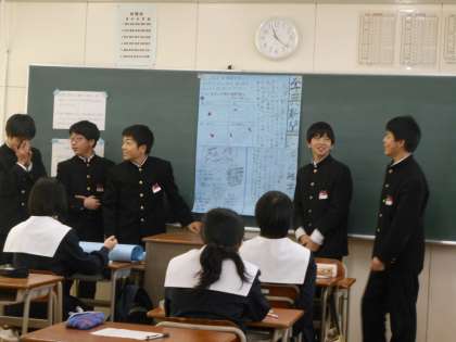 12月19日(水)3年2組で理科の研究授業が行われました。「天体」の分野での調べ学習で、本時は発表の時間でした。数時間にわたって、各班で考えたテーマについてパソコンを使って調べ、それを模造紙にまとめるという準備をして迎えた発表。多くの先生が見ている中、少し緊張している様子を見せながらも、各班個性的でよく頑張っていました。