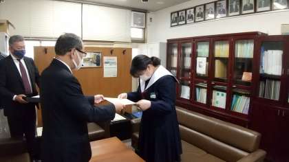 紹介が遅くなりましたが、去る11月20日(金)放課後、西成納税貯蓄組合連合会会長、西成税務署長様にお越しいただき、本校にて「税に関する作文」の表彰状の伝達がありました。