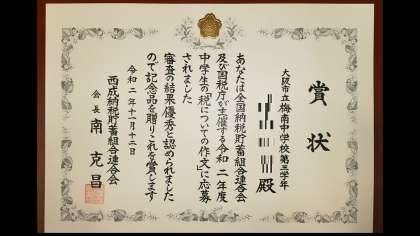 本校生徒は、「西成納税貯蓄組合連合会長賞」を受賞しました。賞状は、当面の間玄関内ショーケースに飾らせていただきます。 -